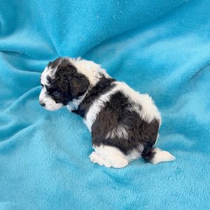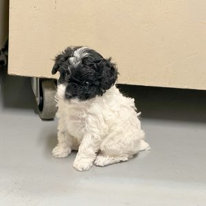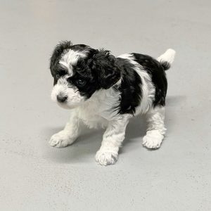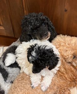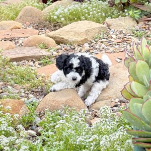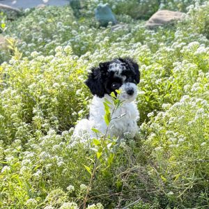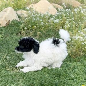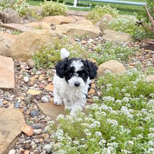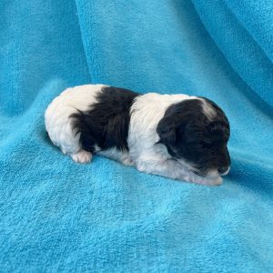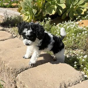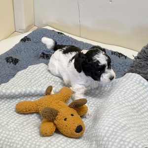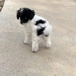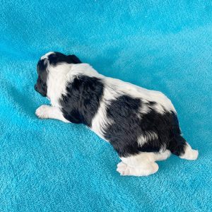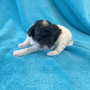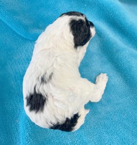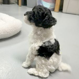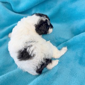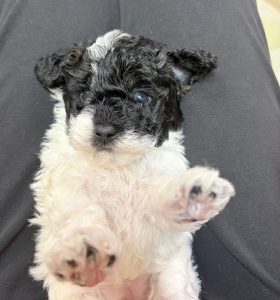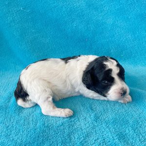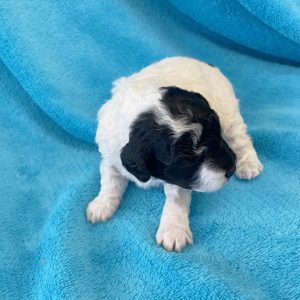 Below are Stevi and Mooki’s new litter, “GIRLS” Black/White, Born Oct 4, 2025 They are all marked so beautifully. Puppies are still young I would only be guessing at their size. All tails are docked and dew claws removed. Stevi puppies do not get too big, more Large Toy/ small mini size. All Available